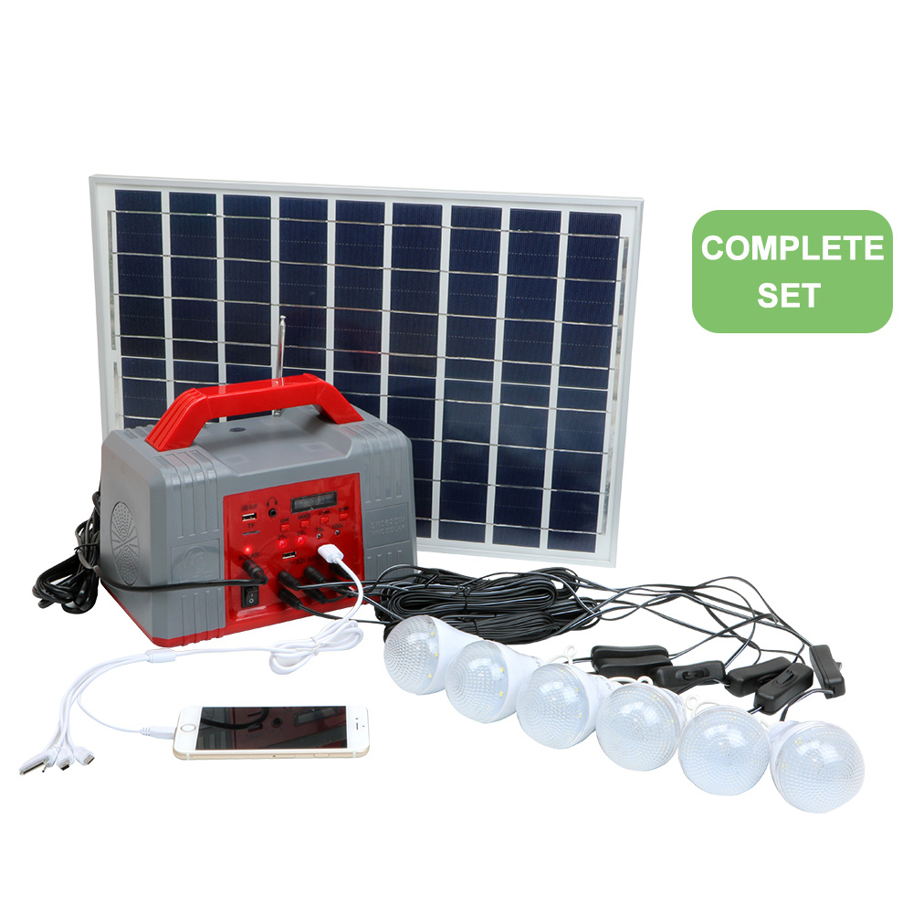 >> The portable solar power kit is including solar poly panel, bulbs, lead acid battery, FM radio.