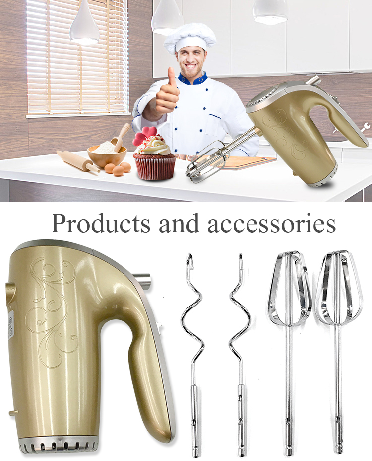 Good start speeds for bulk and dry foods,such as flour ,butter and potatoes ejector for releasing beater and dough hooks better mixing and heavy duty performance hand mixer HA-988II is suit for kitchen use.