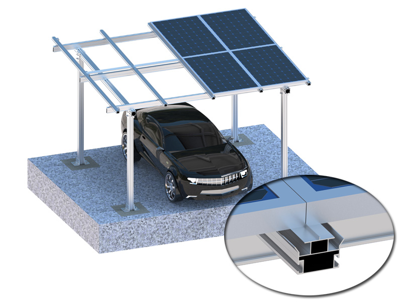 This waterproof solar carport mounting system solutions including gutters and downspouts available. It is the all-aliuminum construction, and the hardware is stainless steel guaranteeing long serviceability. The system when viewed has two vertical columns used to support the solar panels.