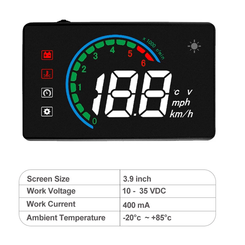 Through the vehicle’s OBD interface, the device can read the real-time data of the vehicle such as: Speed, Coolant, RPM, Fuel consumption, etc, and display the data in the glass of vehicle which will prevent looking-down during driving process and improve driving safety greatly. HUD display brightness will be adjusted automatically according to real-time environment. Bright on day-light and soft at night.
