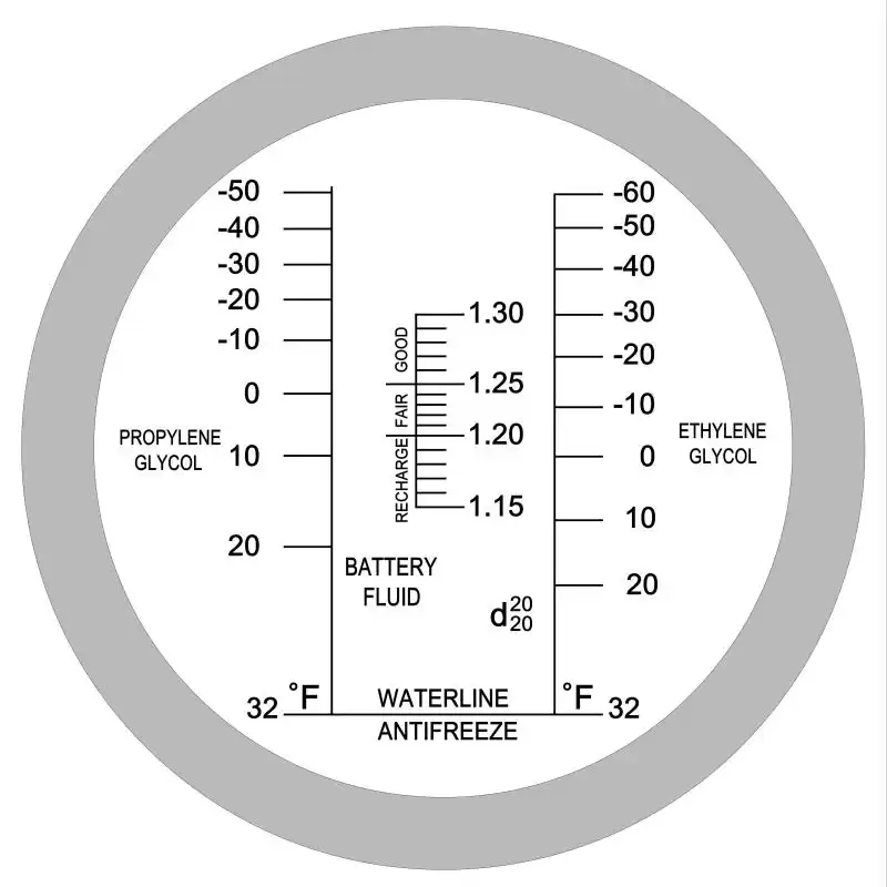 Measures freezing points of ethylene and propylene glycol coolants and the specific gravity (SG) of battery acid—all displayed in Fahrenheit.