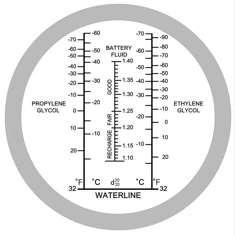 Covers coolant freezing point for ethylene and propylene glycol, and battery fluid specific gravity in one compact device.