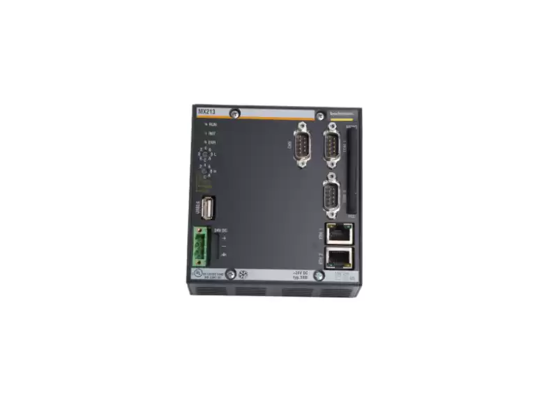 MX213 is the main CPU card of the Bachmann MX200 family. It integrates a 32-bit PowerPC 750 @ 266 MHz, 256 MB DRAM and 512 kB nvRAM on a single 3U CompactPCI board, turning any M1 rack into a real-time controller for wind turbines, rolling mills or marine drives.