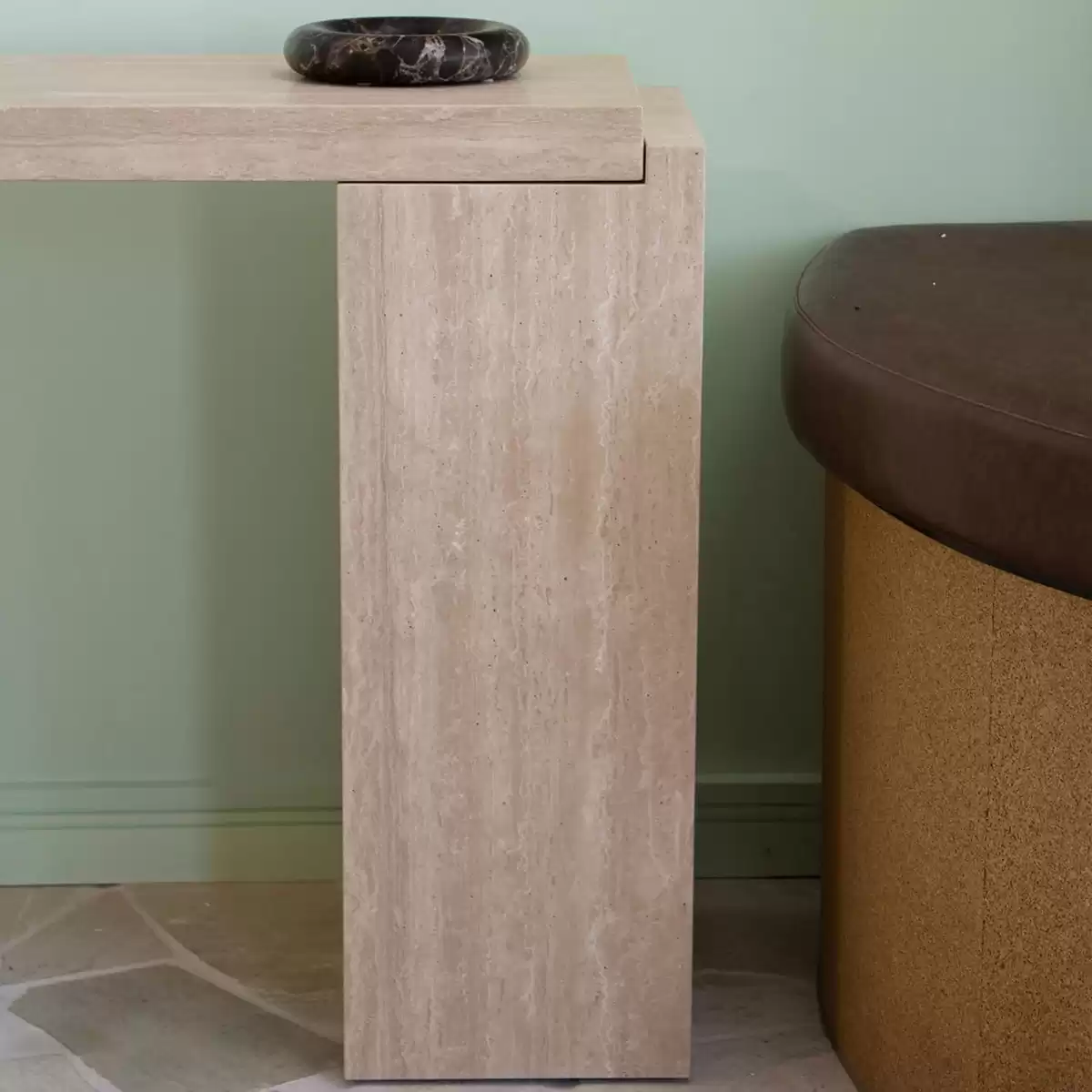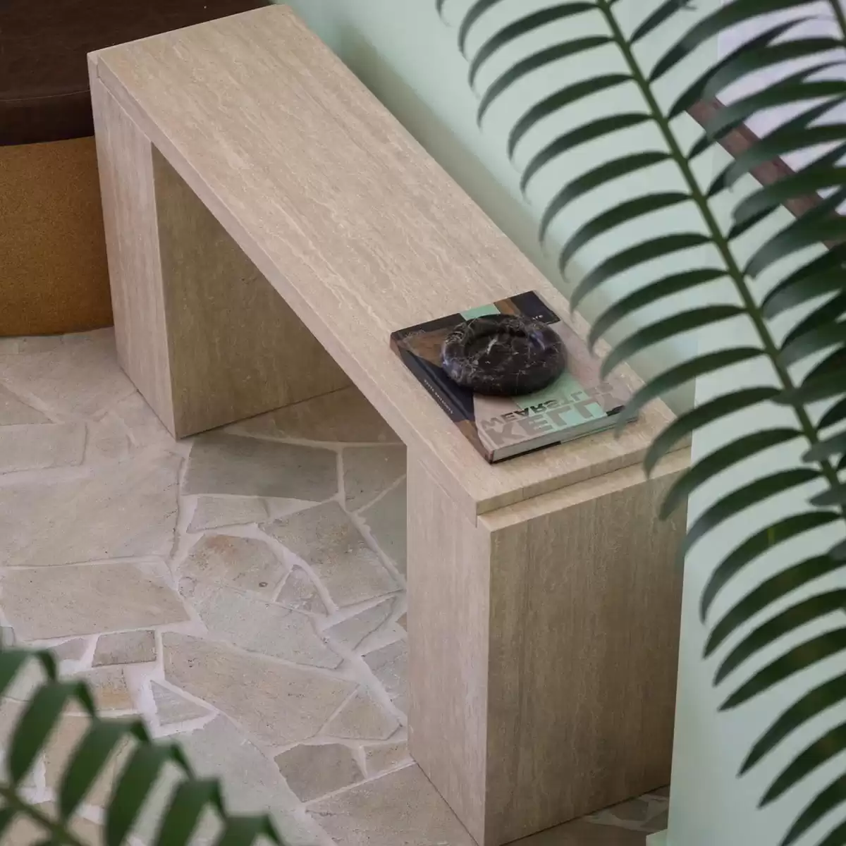 The Travertine Console Table commands attention with its monolithic silhouette: a masterclass in minimalism delivering maximum impact. This striking narrow table transcends mere function, blurring the boundary between sculptural modern art and essential furniture. Crafted from richly patterned Travertine, its bold geometric form harnesses the stone's organic veining, forging an undeniably contemporary classic destined to define sophisticated spaces.