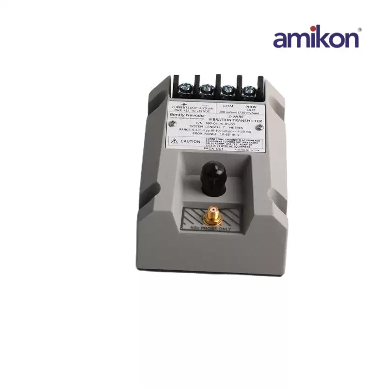 The 990-04-70-01-00 is Vibration Transmitter.The 990 Vibration Transmitter is intended primarily for the original equipment manufacturers (OEMs) of centrifugal air compressors or small pumps, motors, or fans who prefer to provide a simple 4 to 20 mA proportional vibration signal as the input to their machinery control system. The transmitter is a 2-wire, looppowered device that accepts input from our 3300 NSv* proximity probe and its matching extension cable (available in 5 m and 7 m system length options).