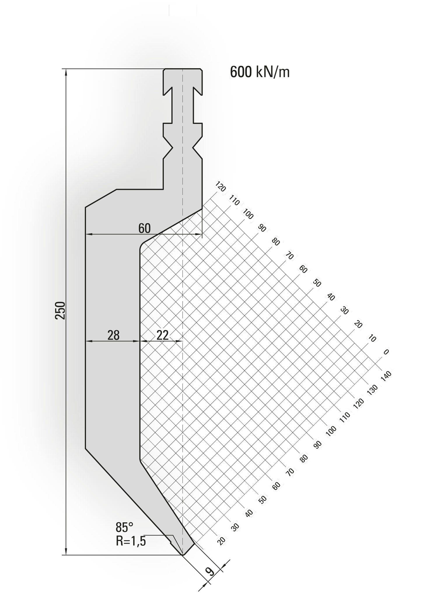 The punch size is 250*60*515mm, 85degree, the material is 42CrMo4, the weight is 25.6kg. Welcome to explore our quality press brake tooling and contact us for professional service!