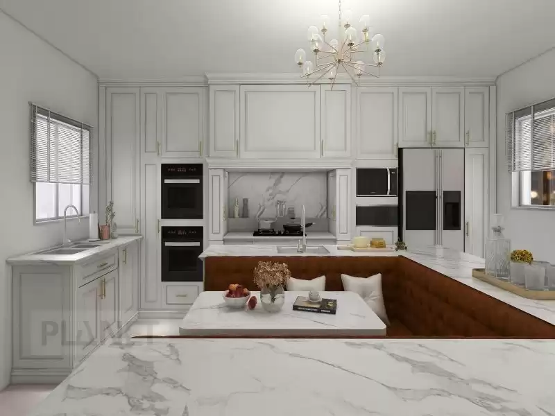 3.Freestanding white panel island connects to dining table