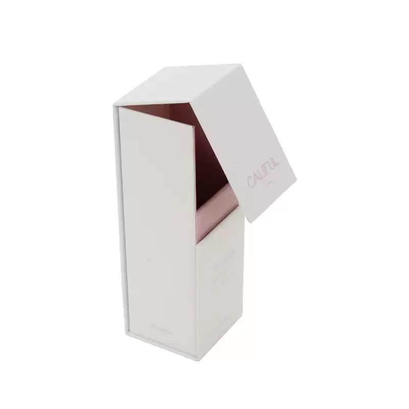 This is a small size standing magnetic box which made by 157g art paper+1200g grey board,outside full of matte white and mouted inside pink cardboard.