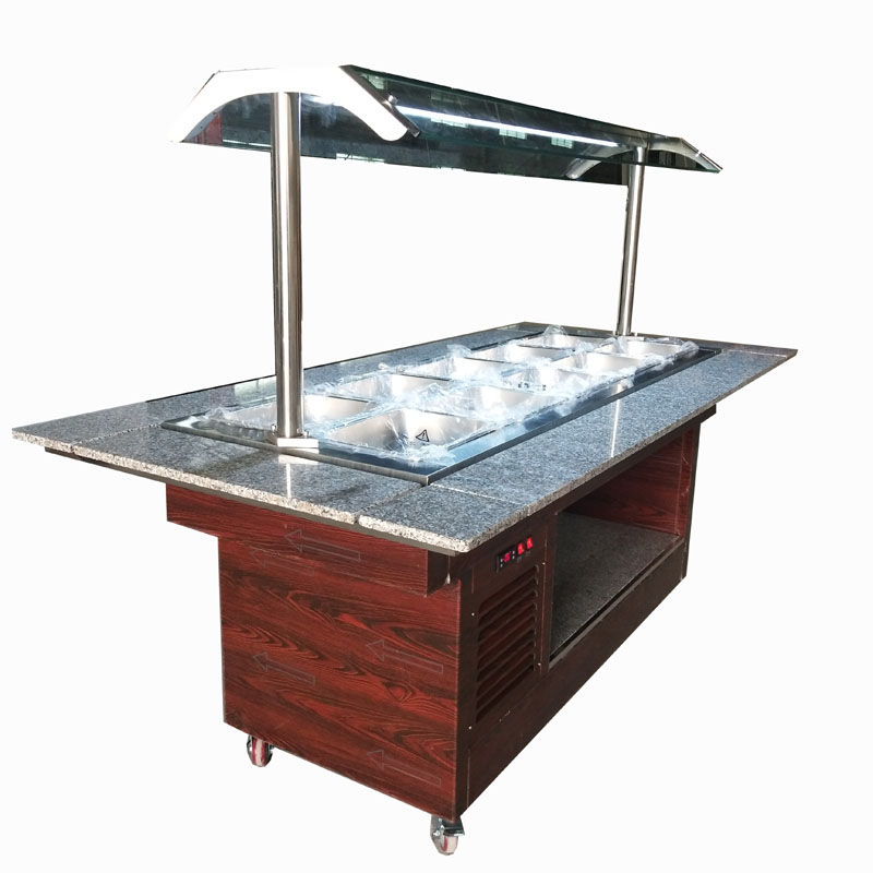 The customized simple wood-like stainless steel cold buffet table is made of outer three-dimensional oak wood-like stainless steel. The countertop and liner are 201 stainless steel, and the countertop is granite stone. Direct cooling temperature 5 ~ 10 degrees, put 10 325 * 265 * 100mm stainless steel discs, adopt imported compressor, the bottom is movable wheel for easy movement. Can be customized according to customer specific requirements.