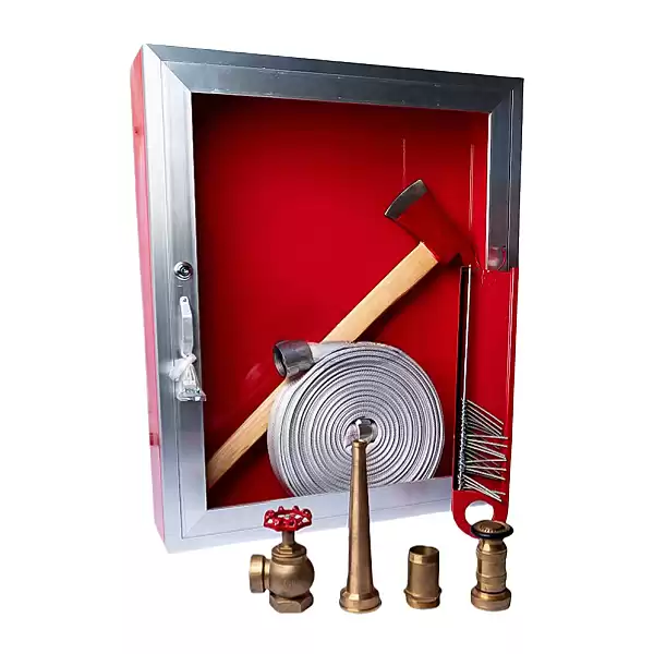 The cabinet comes fully equipped with all necessary accessories to ensure immediate usability: clear glass (for easy visibility of internal equipment, allowing quick confirmation of tool completeness), a fire hose hoserack (to neatly store the 100ft fire hose, preventing tangles and ensuring smooth deployment), an angle valve (to control water flow to the hose), a brass nipple (for secure connection between the valve and hose), a fire axe (for emergency breaking or rescue), and a brass nozzle (with optional straight or fog spray patterns—straight for long-range fire targeting, fog for wide-area cooling and smoke suppression). Additionally, optional upgrades include polycarbonate nipples (for enhanced impact resistance) and specialized straight/fog nozzles, allowing customization based on specific building fire protection needs.