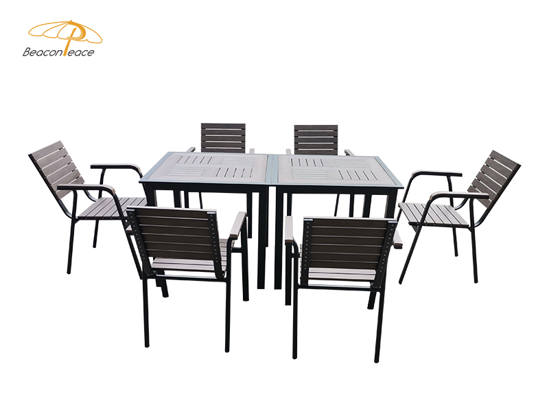 - The Outdoor plastic wood Dining set made of Aluminum frame, and plastic wood. Suitable for Dining, Outdoor, Hotel, Villia, Apartment, Park, Courtyard, Hall, Home Bar, etc.