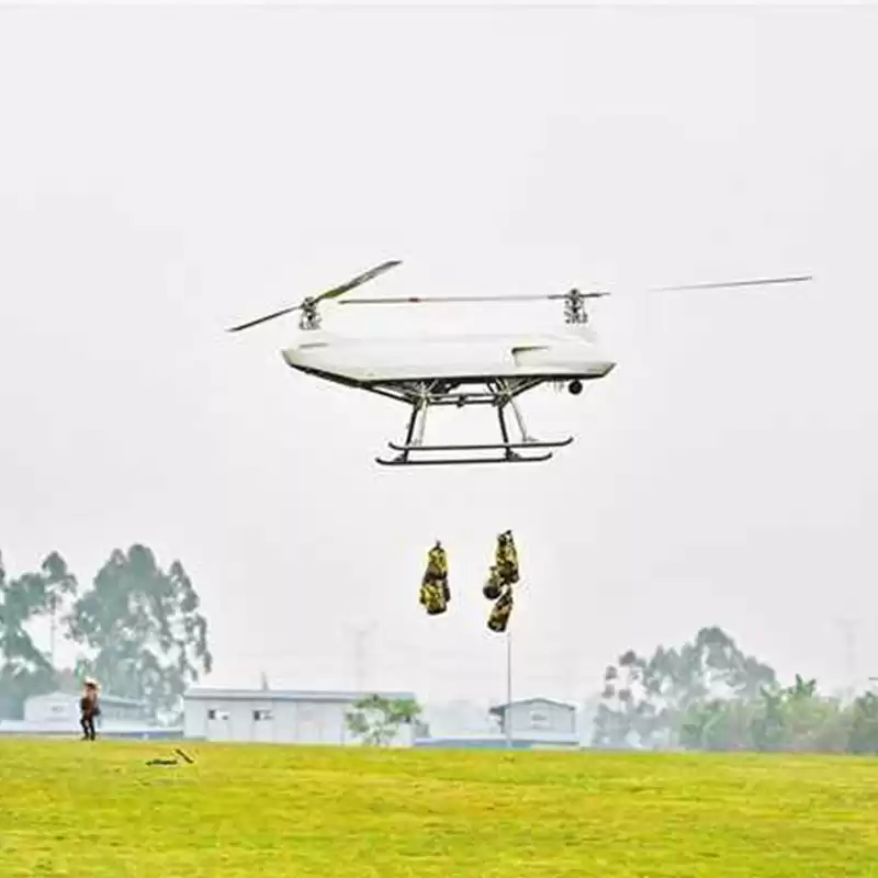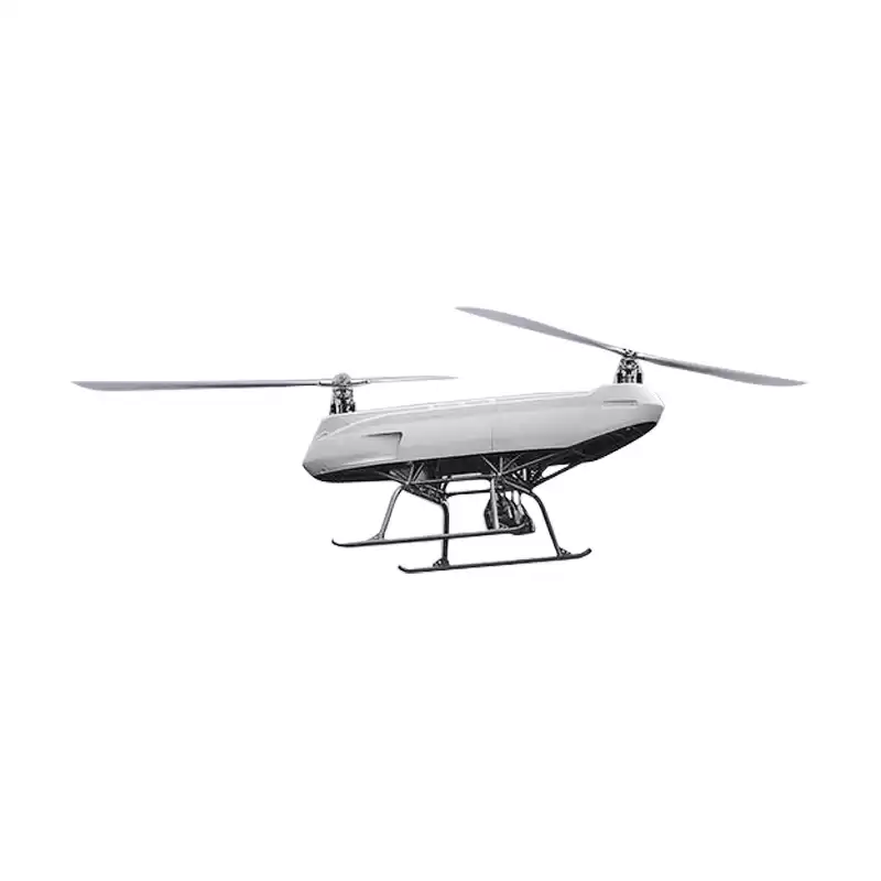 This vertical unmanned helicopter ZS-06 has low requirements for takeoff and landing site conditions and good environmental adaptability. Its longitudinal configuration and titanium alloy fuselage design combine load-bearing capacity and stability, equipped with a high safety power system, fully autonomous flight, and advanced control system to ensure reliable flight and meet diverse operational needs. It can perform tasks such as equipment transportation, material delivery, and emergency rescue.