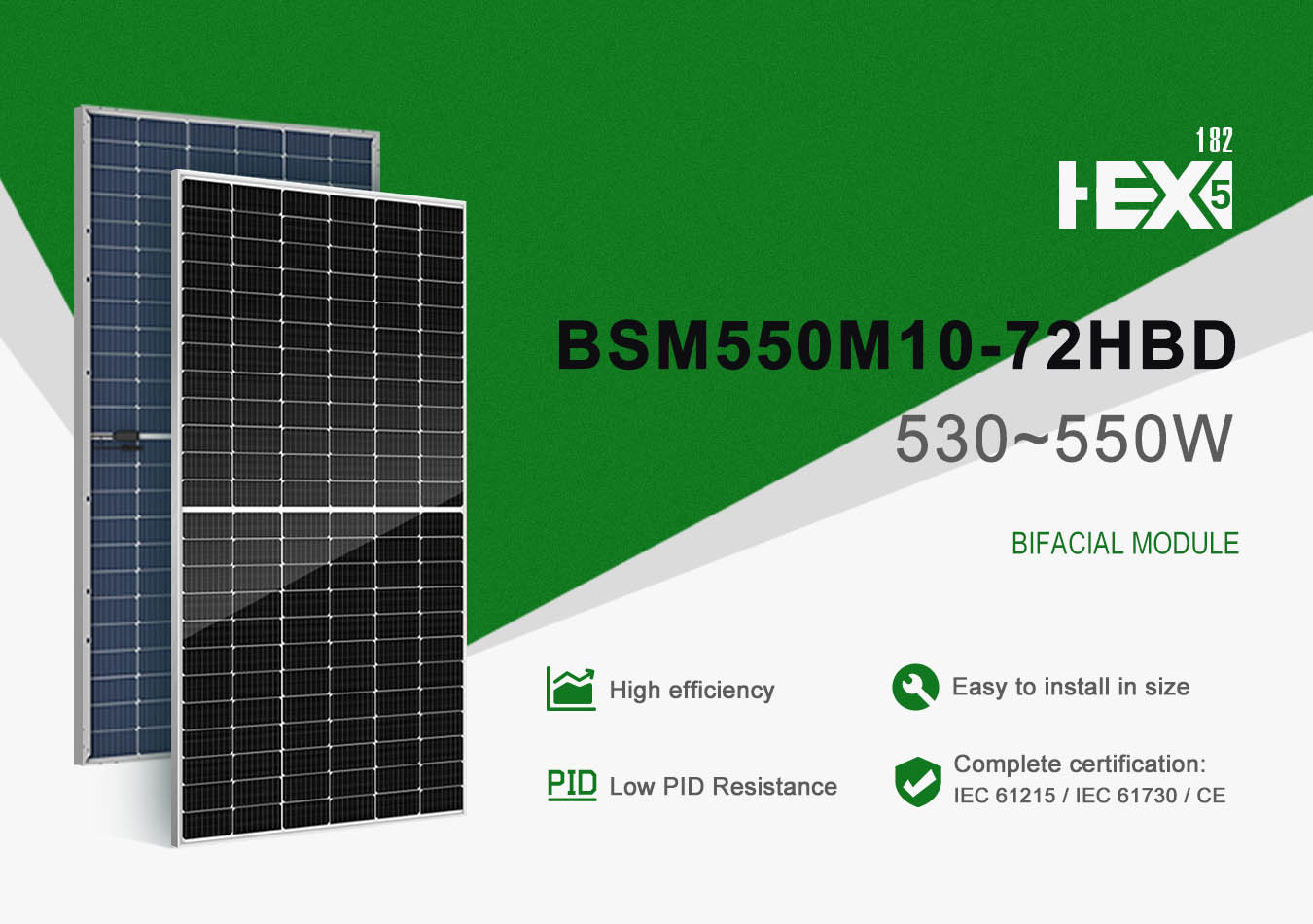 Bluesun HEX5 series monocrystalline solar panels use half cell PERC cells,it has a passivated rear side and a laser grooving process,which significantly improves the cell efficiency,power range from 530-550w.Passed IEC 61215, IEC 61730,UL 61730,INMETRO test for harsh environment.
