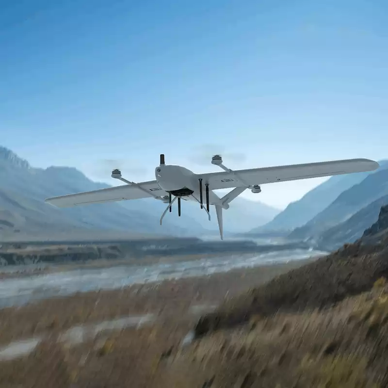 The FY-S01 vertical take-off and landing fixed-wing unmanned aerial vehicle (UAV) features folding wings and a tool-free quick-disassembly design, facilitating rapid deployment and flexible expansion. It is equipped with a redundant flight control system, high-definition real-time video transmission and multi-protocol PTZ interfaces, adapting to the requirements of different tasks. The high-performance handheld ground station that comes with it features long-distance low-latency communication, a high-brightness touch screen, and long battery life. It supports secure encrypted data transmission and is suitable for various professional scenarios such as mapping, inspection, and reconnaissance.