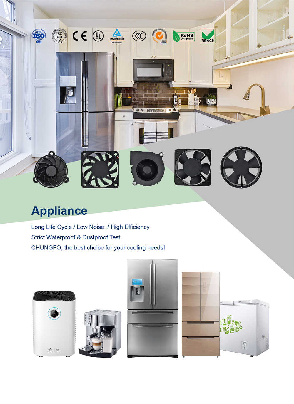 DC/AC axial fans with many models can be used for cooling, ventilation and heat dissipation in freezers, refrigerators, air purifiers, cabinets, power supply and ect.