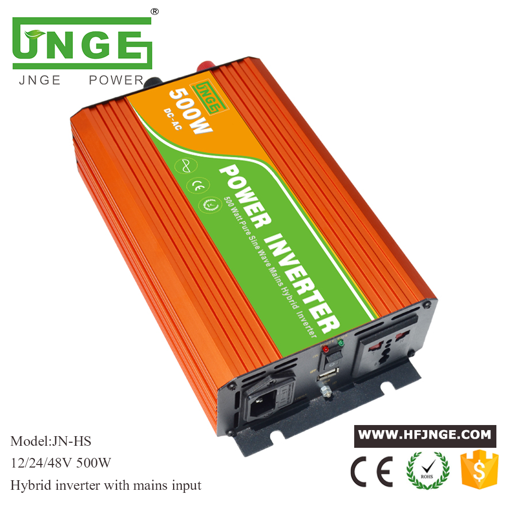 This is a 500W 12V 24V 48V 96V (optional) pure sine wave power inverter hybrid type which can generate 500W of continuous power and up to 1000W of power at peak times (peak time reserve capacity is useful if more energy is required to start an appliance than for its continuous running).It has hybrid function with AC mians ,you can set battery working in priority or AC mains working in prioroty as your demand.