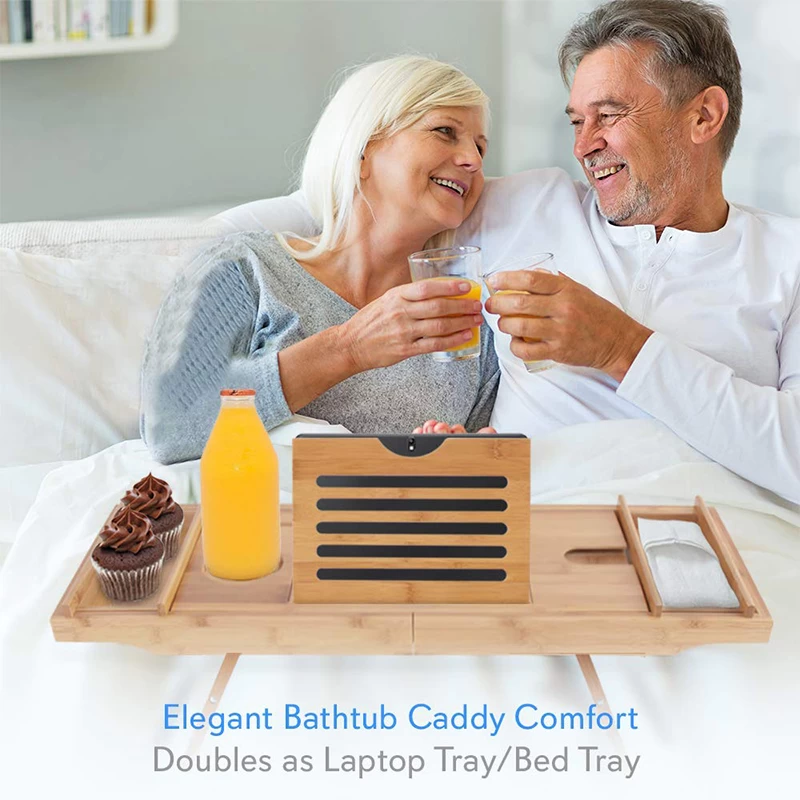 DEVICE HOLDER: The bathtub caddy is ergonomically designed with a device holder for tablet, smartphone and book. There are cut-out grooves for wine glass and candle placement, plus removable trays for bath accessories like soap holder too