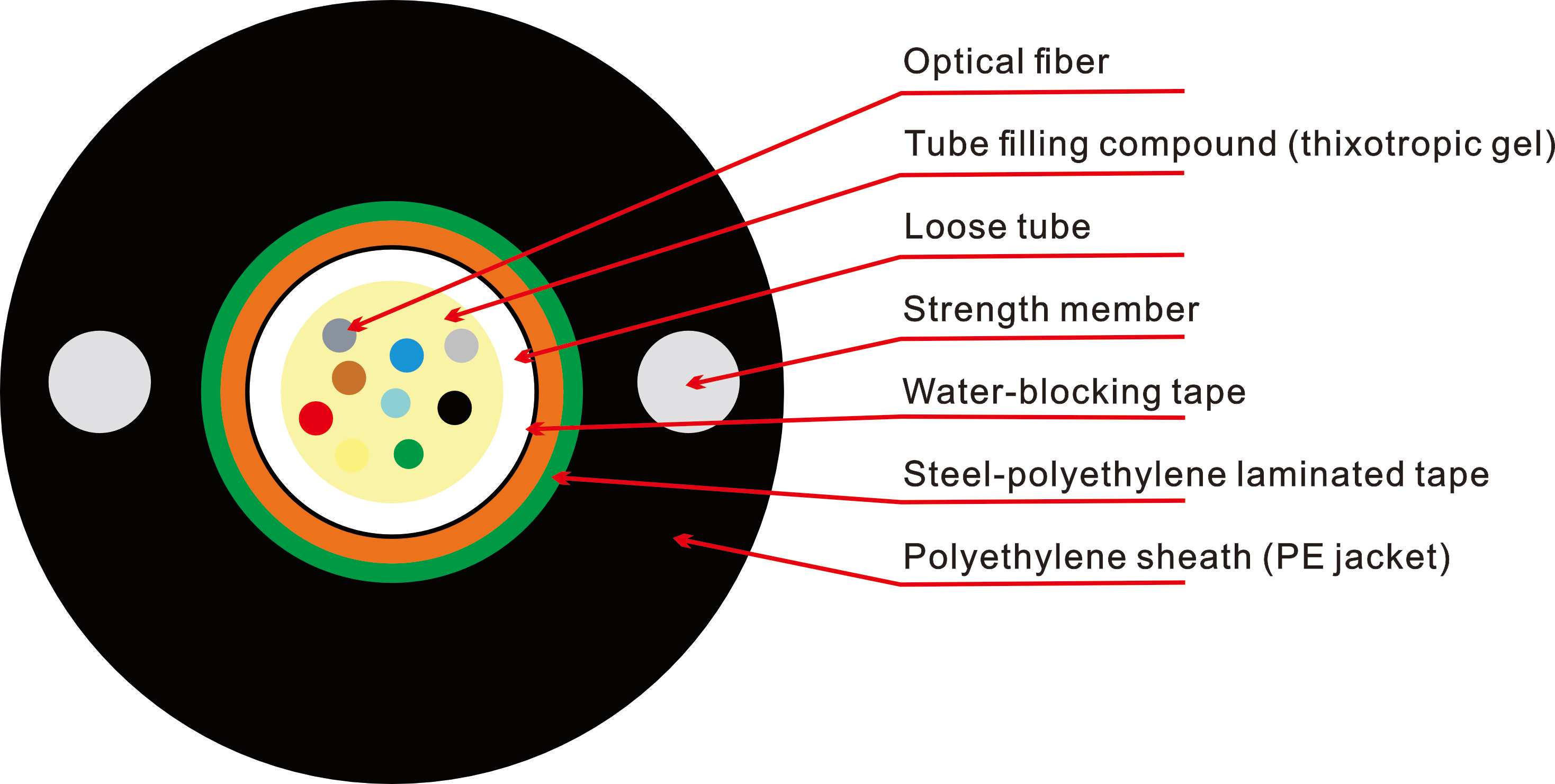 Water‑blocking: Gel‑filled tubes and/or water‑swellable yarn/tape