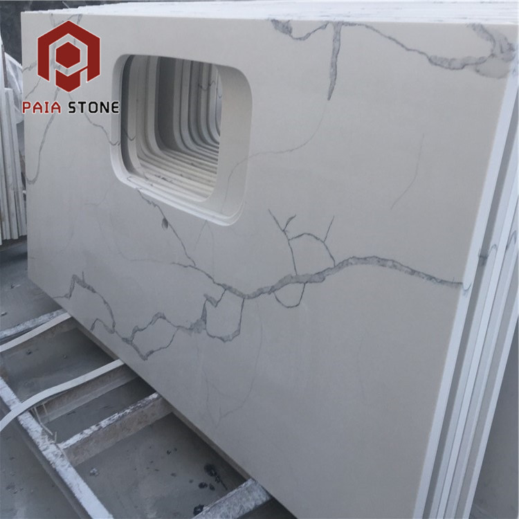 Artificial marble countertop, pure white background color, gray grain.It looks like marble, and it's cheaper than marble.It is a modern kitchen designed to replace the affordable white marble.