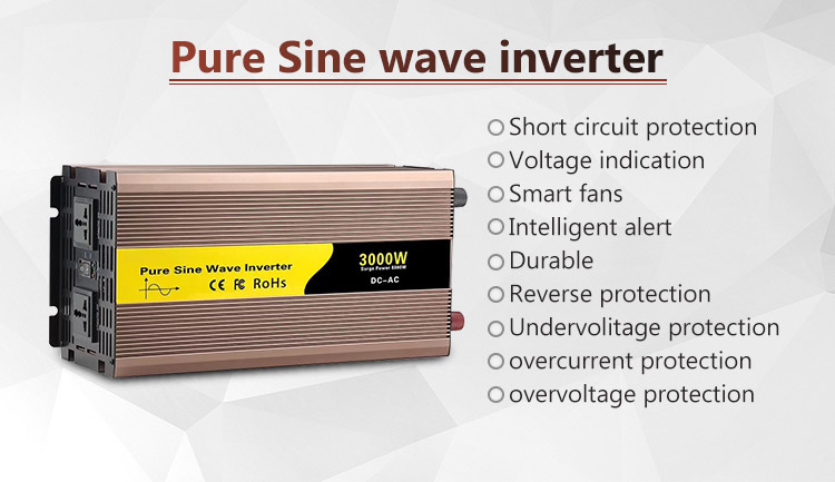 100% pure sine wave output,low distortion,wave form and mains power line AC wave form base consistent, small precision equipment interference, low noise,strong load capacity,can satisfy any type of AC load,does not damage the load