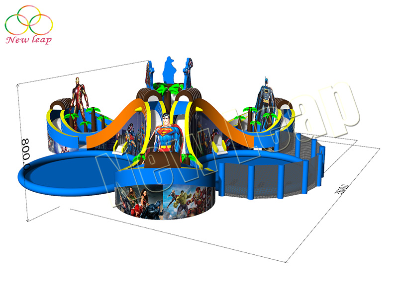 The Avengers theme inflatable water park is a peculiar inflatable playground on the water. It consists of three large pools and three sets of slides. There can be some water toys in the pool (inflatable water ball, inflatable slides, inflatable water obstacles, etc.), as well as some props, which can be used by many people to play and have a happy summer.