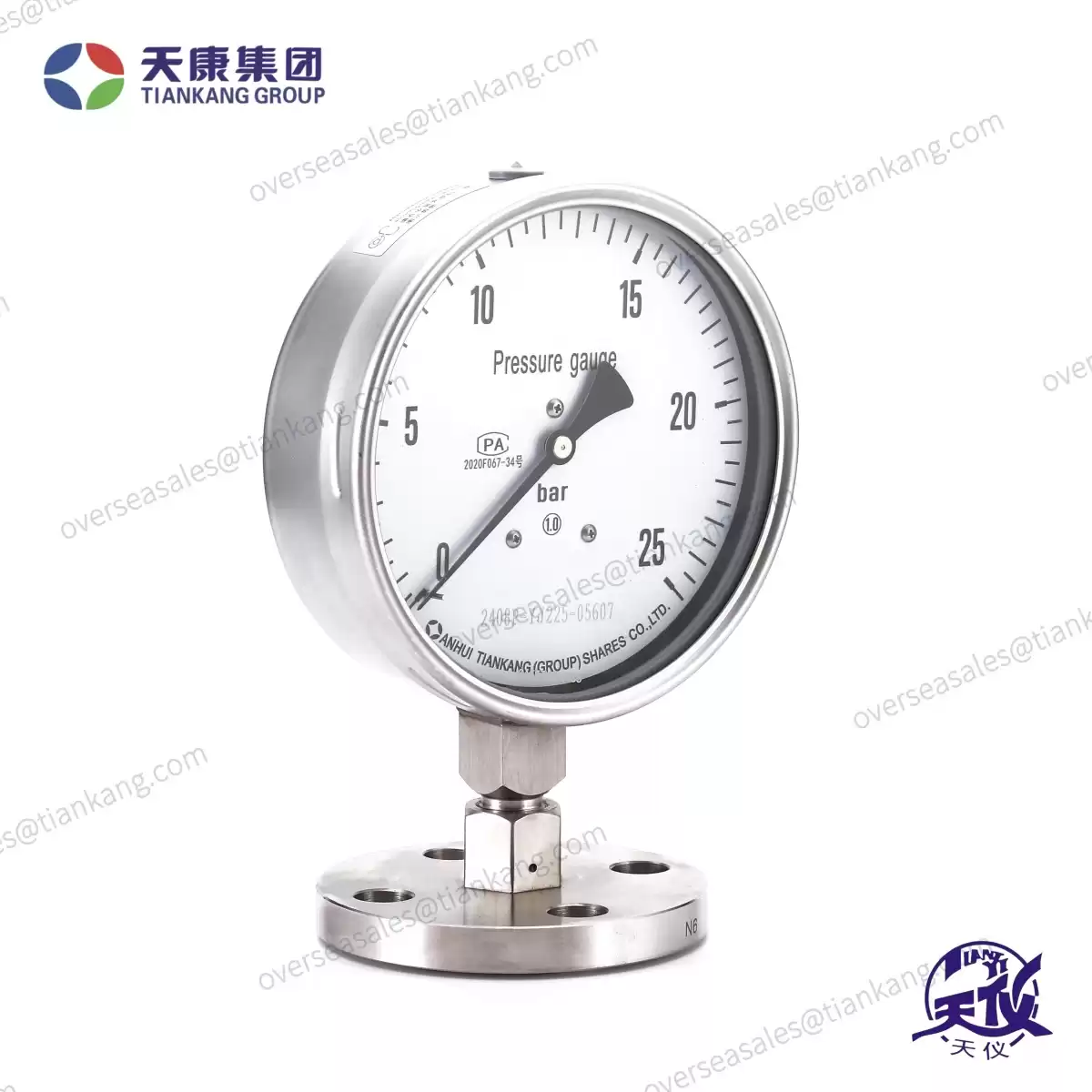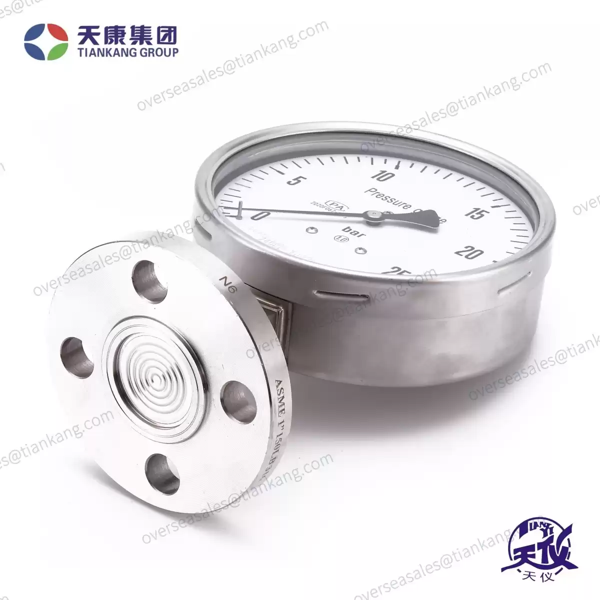 Tiankang diaphragm pressure gauge is mainly used in process industries such as petrochemicals, alkali production, chemical fibers, pharmaceuticals, and food processing. It consists of a general-purpose pressure gauge along with a connector and a diaphragm isolator. It is used in situations where the measuring medium is highly corrosive, high temperature, high viscosity, prone to crystallization, prone to solidification, or contains solid particulates.
