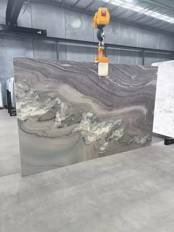 Macaubas Fantasy Quartzite is a stunning natural stone from Brazil, known for its captivating purple and violet tones accented by intricate patterns. Macaubas Fantasy Quartzite Slab is prized for its durability and resistance, making it suitable for various applications.