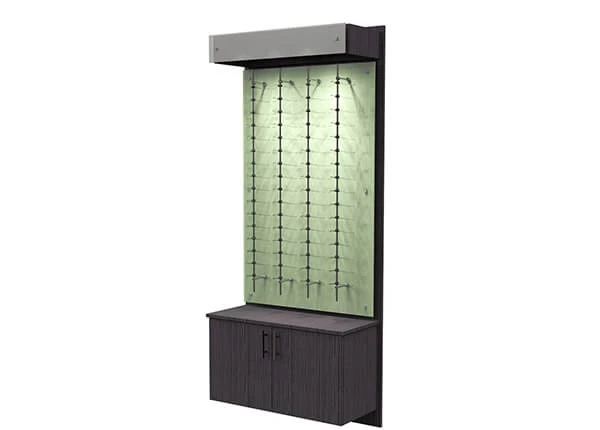 This optical wall display design standard: wood ( baking paint or veneer finishes ) , display rods ( metal ) , light box, storage cabinet or drawers (can lock), logo, laminated deck, dust resistant, electrical cord with switch.