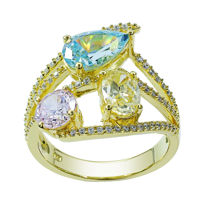 This classic 925 sterling silver ring setting with our high quality and unique Aqua CZ, Diamond Pink CZ and Diamond Yellow CZ, Plating in yellow glod.